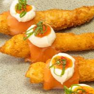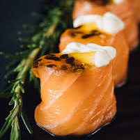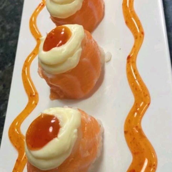 Camarão empanado enrolado a uma fatia fina de salmão com cream cheese