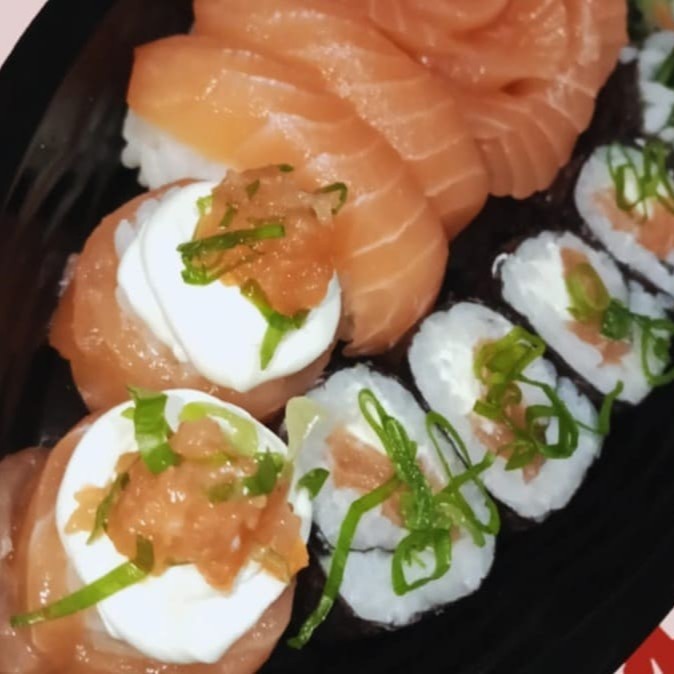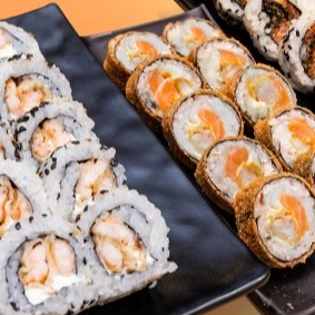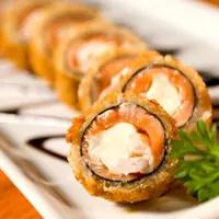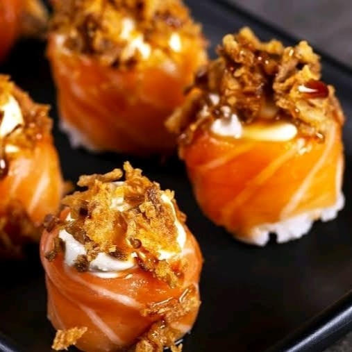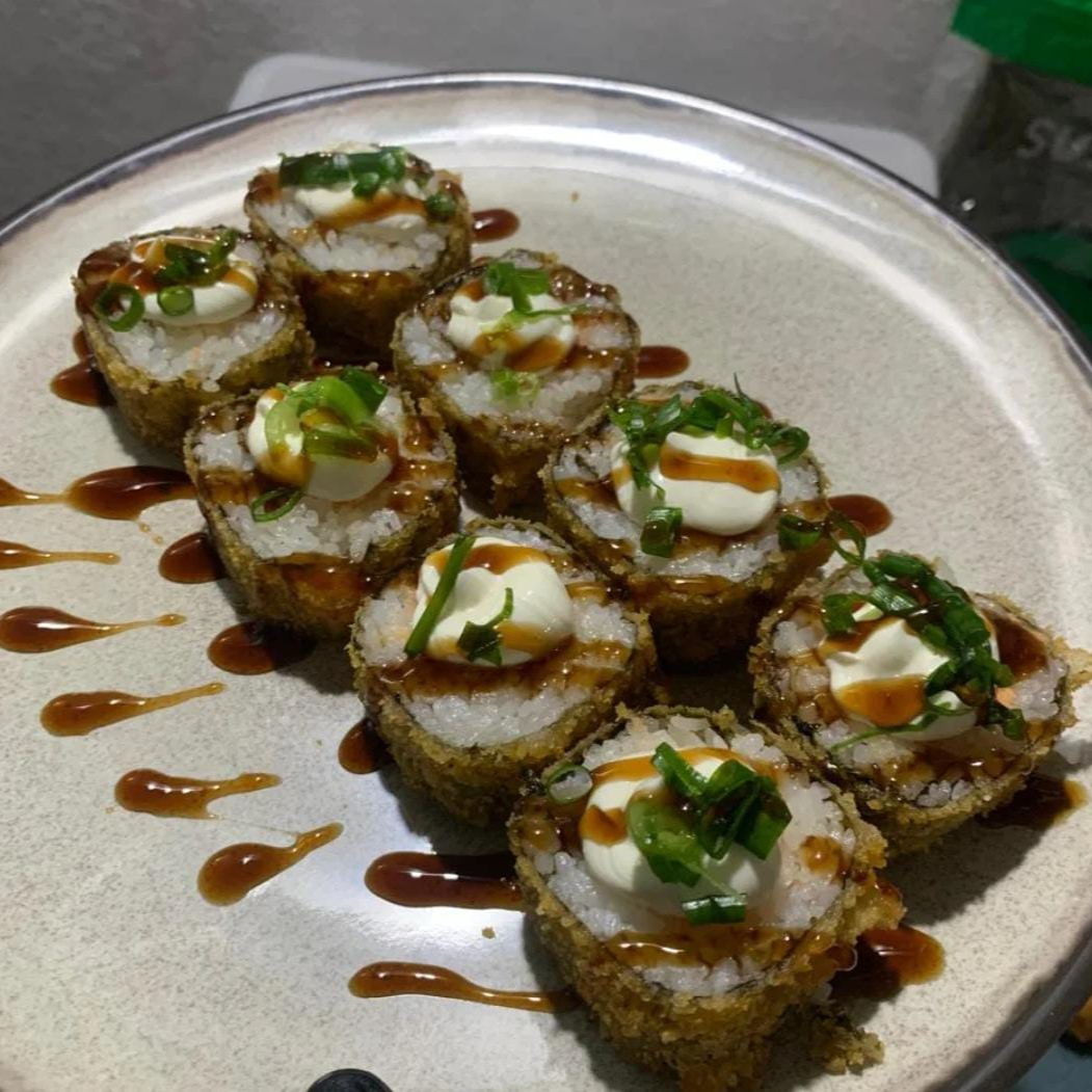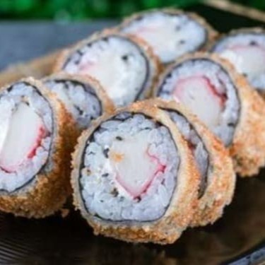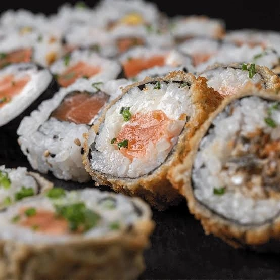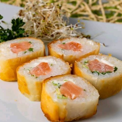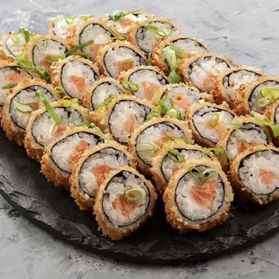 Base de arroz, empanado e frito, cortado ao meio com recheio de salmão fresco cortado em cubos, cream cheese e cebolinha. Aprox 400 g