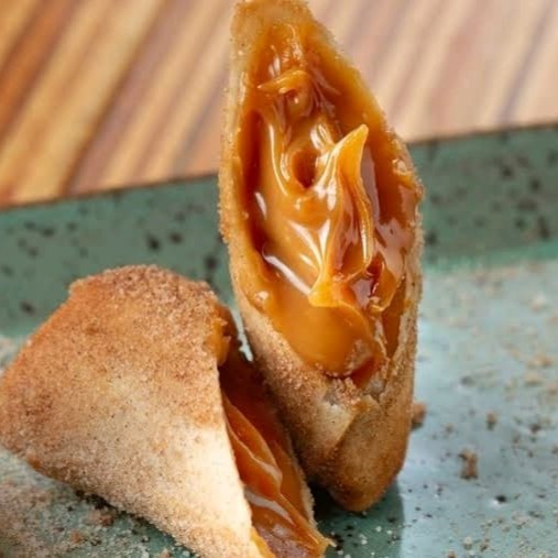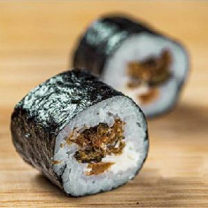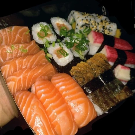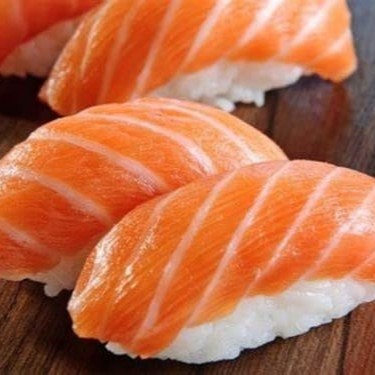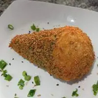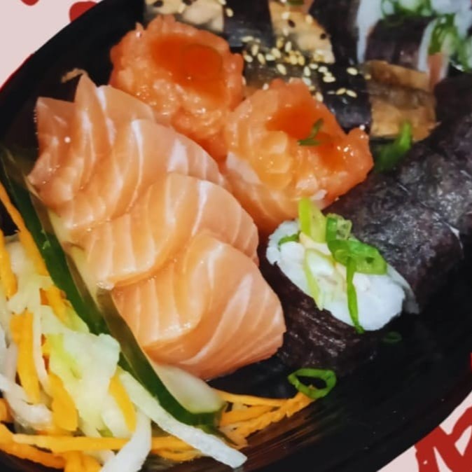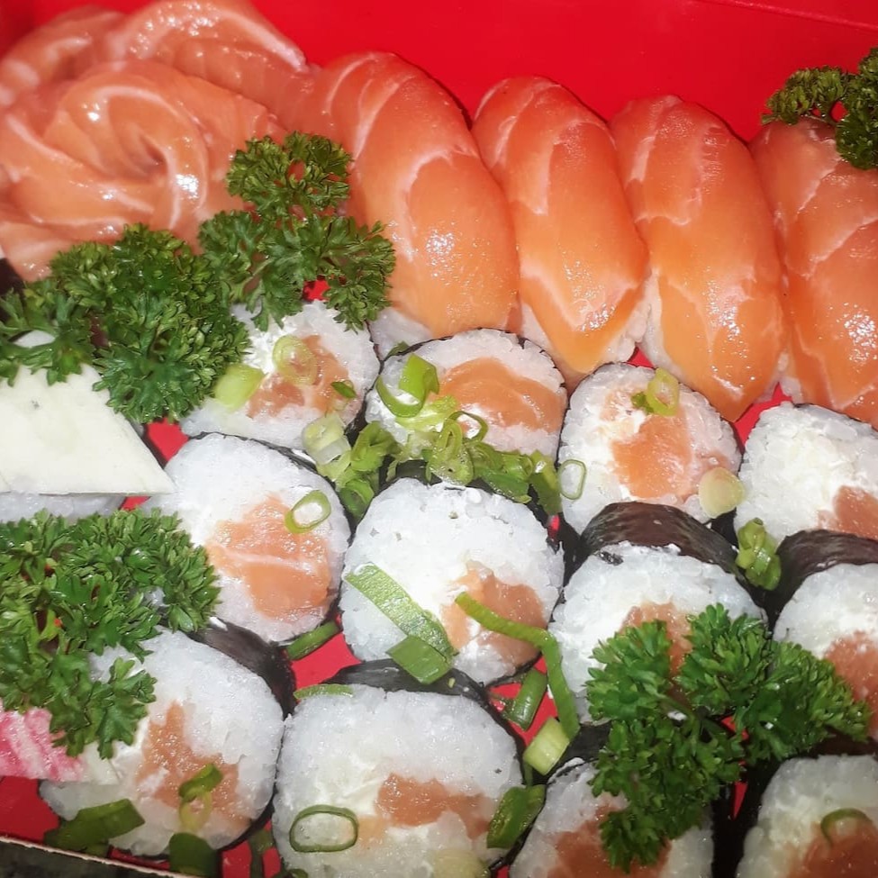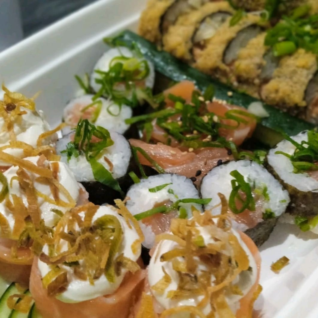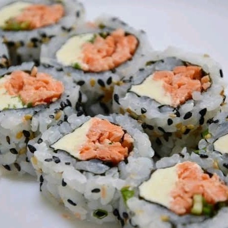 Base de arroz, empanado e frito, cortado ao meio com recheio de salmão fresco cortado em cubos, cream cheese e cebolinha. Aprox 400 g