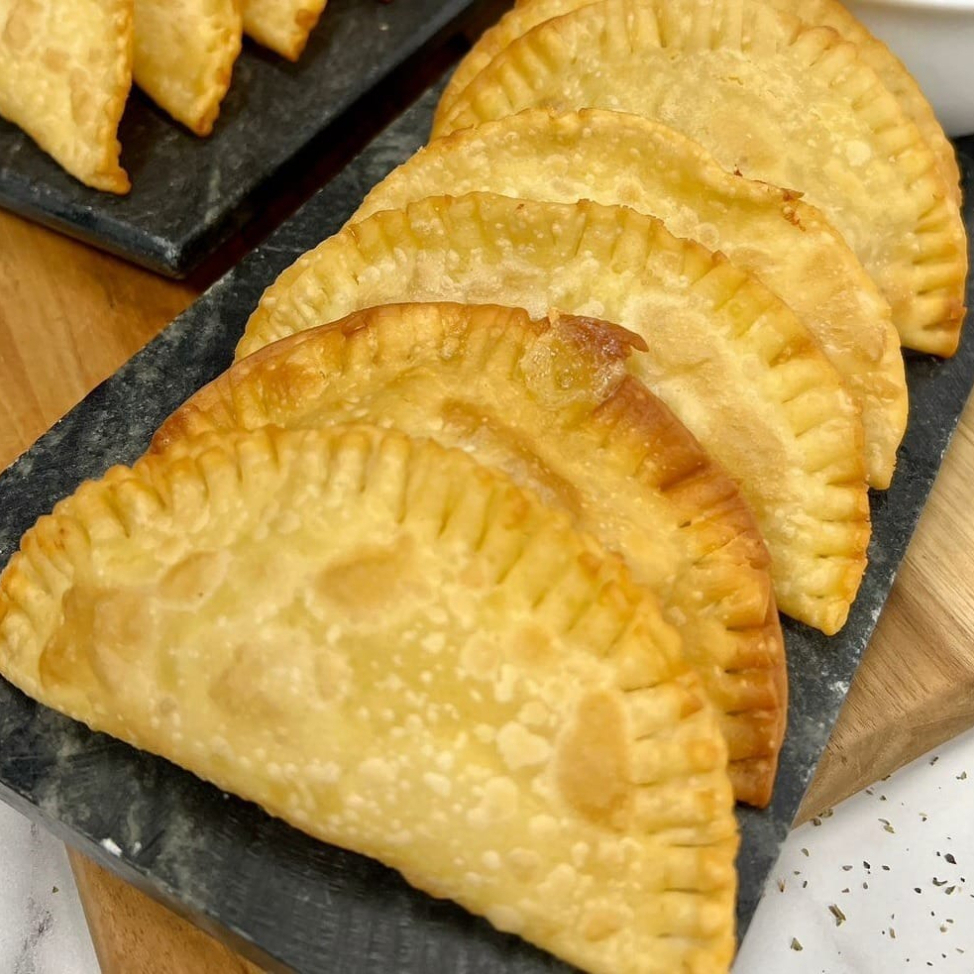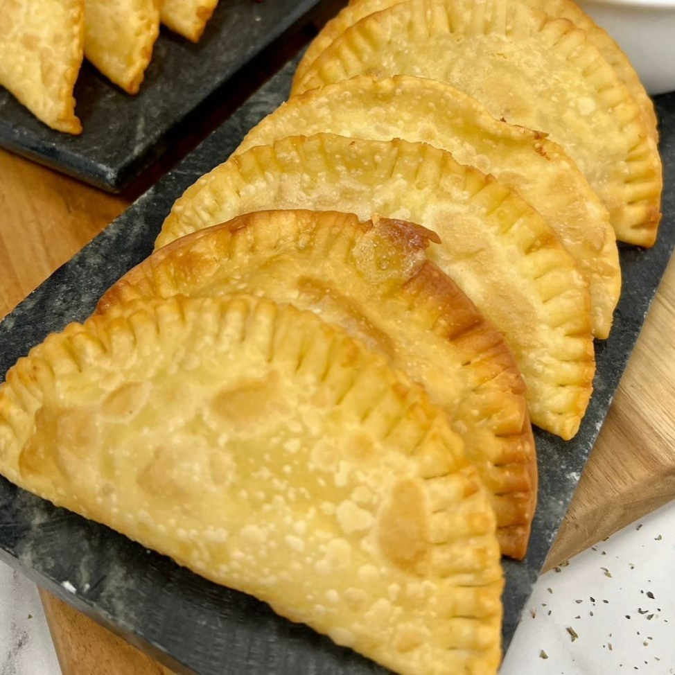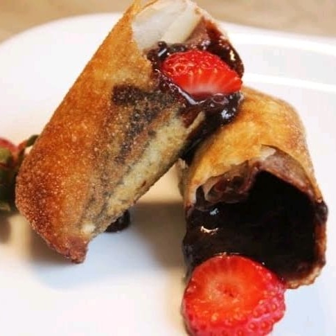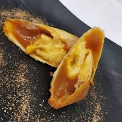 Banana enrolada na alga, empanada, cortes finalizados com chocolate