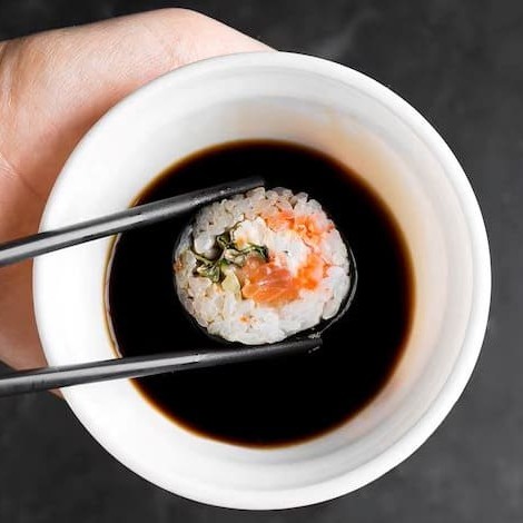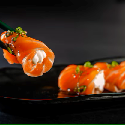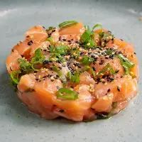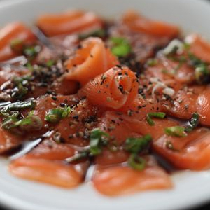 10 lâminas de salmão com gergelim e cebolinha, ao molho ponzo