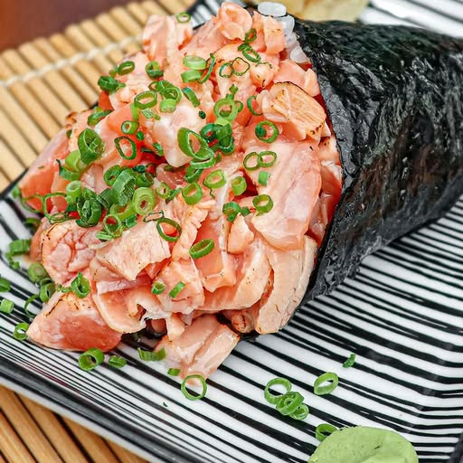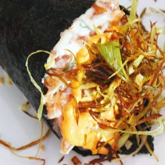 Alga enrolada em formato de cone, arroz, salmão massaricado e cream cheese