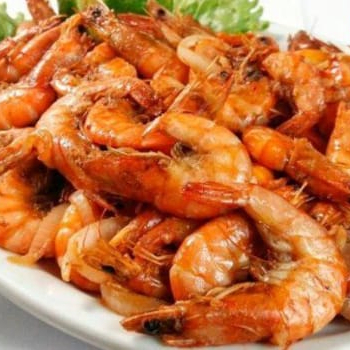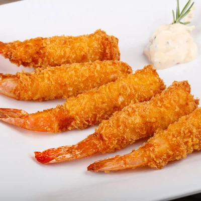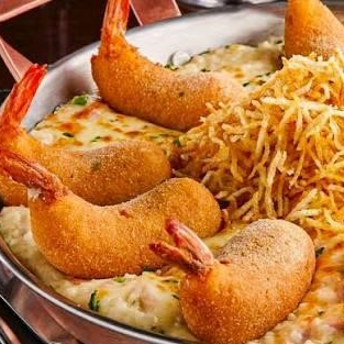 Arroz cremoso, presunto, ervilhas, molho branco com camarão cozido e empanados, finalizado com queijo e batata palha (500 g)