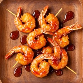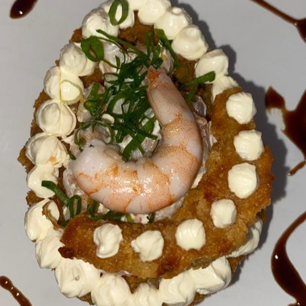Base de arroz empanado crocante com camarão cozido, cream cheese, camarão empanado e cebolinha