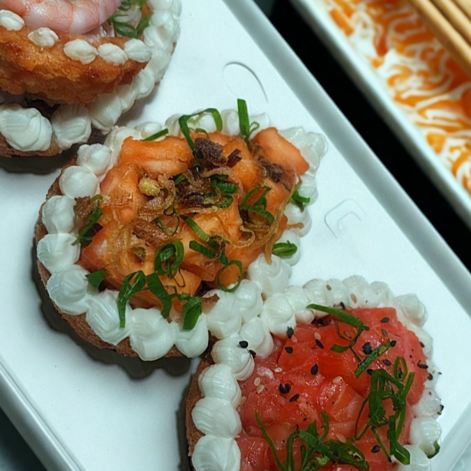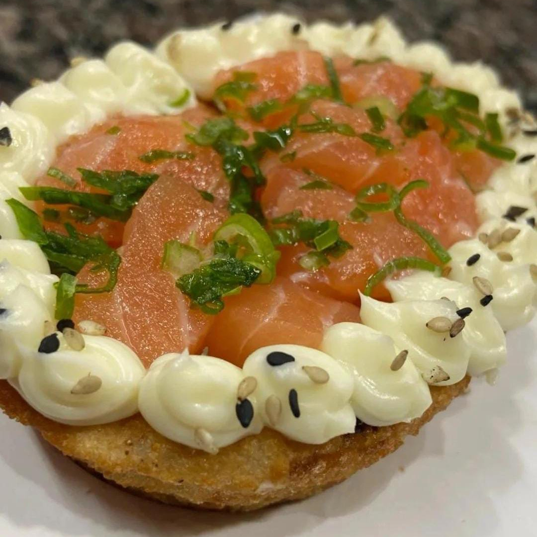 Base de arroz empanado crocante com recheio de salmão em cubos cru, cream cheese e cebolinha