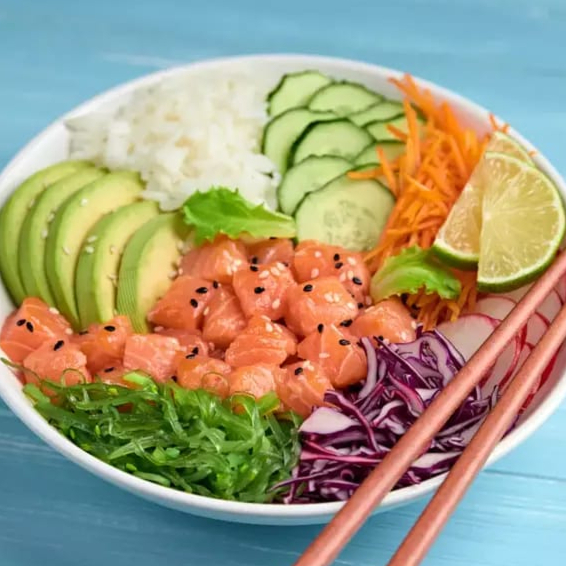repolho roxo, repolho verde, cenoura, macarrão nissim, salmão e temperos do chef
