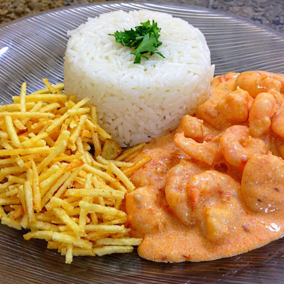 Arroz, strogonoff de camarão e batata frita (500 g)