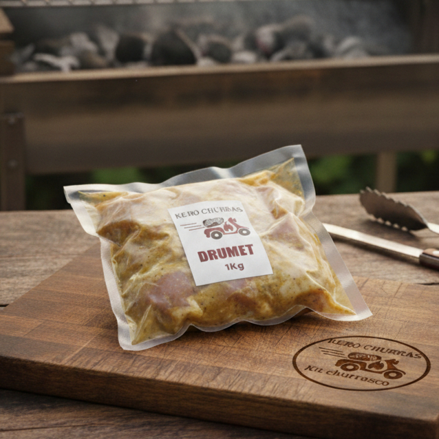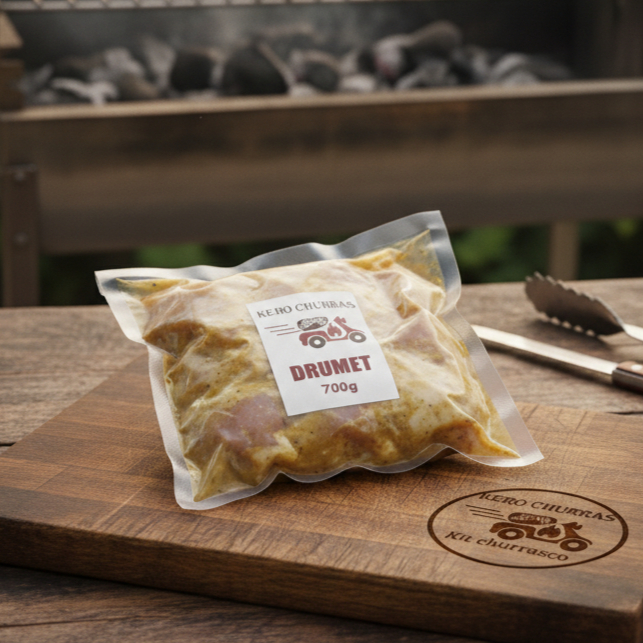 Kit para 6 pessoas. 1 kg Contra filé grill, 700g Drumet temperada, 700g Linguiça de churrasco, 1 pct de pão de alho, 1 farofa 300g. Sal de Parrilla 100g. Carvão 3 kg