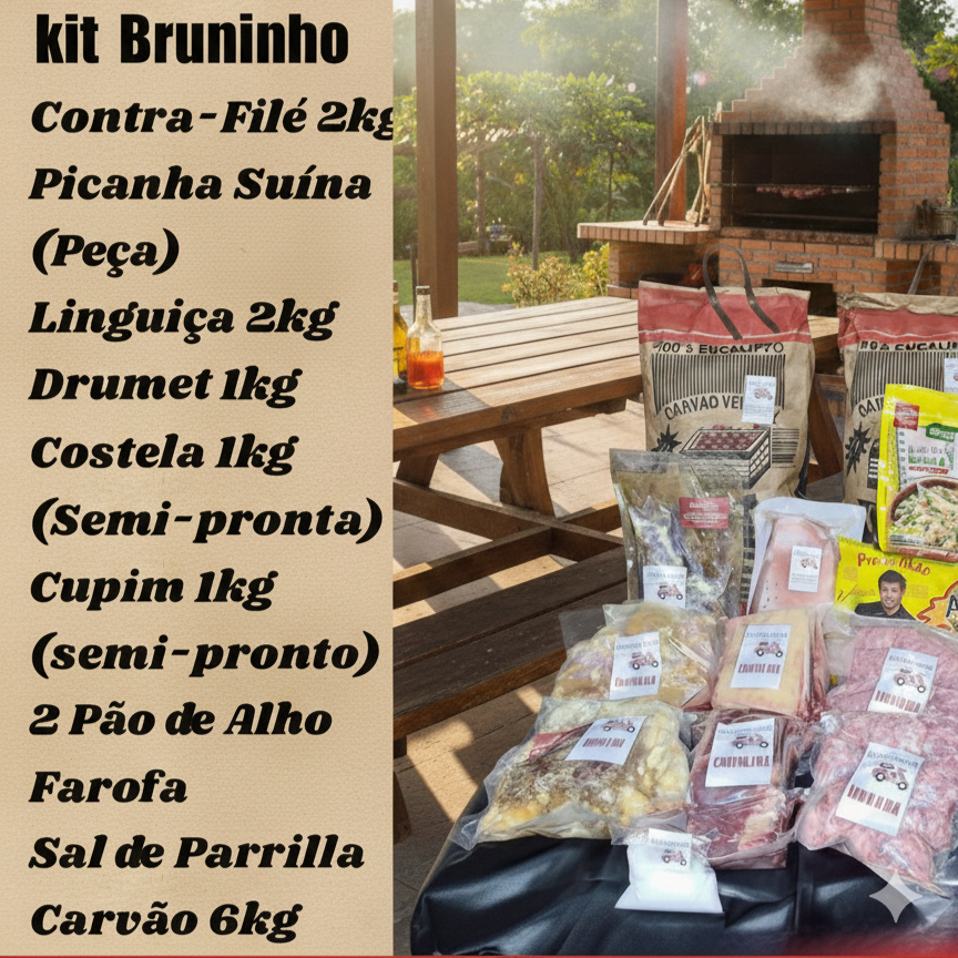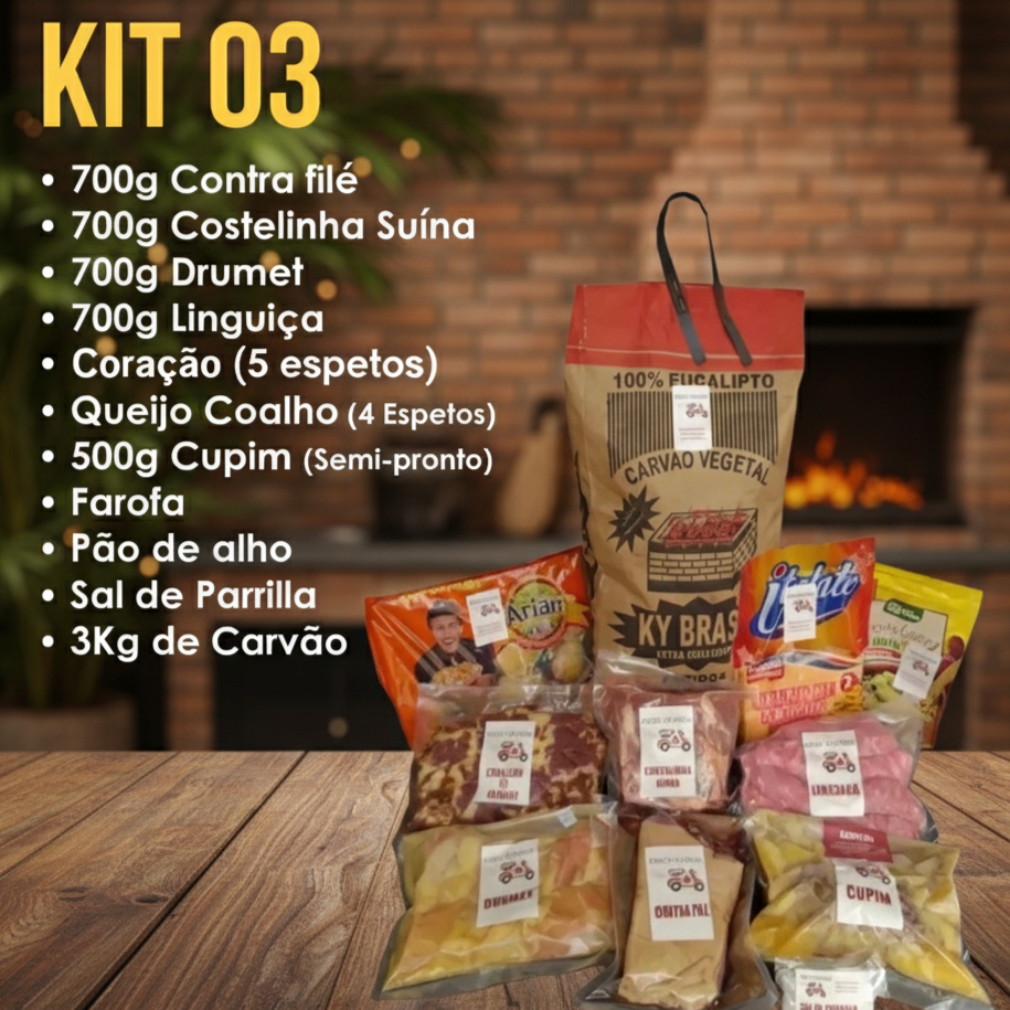 Kit para aprox. 9 pessoas - Contra Filé Grill (700g). Costelinha suína semipronta (700g). Drumet no tempero especial kero churros (700g) Coração no shoyo (5 espetos). Linguiça suína (700g). Cupim semipronto (500g). 1 pct de Pão de alho. Queijo coalho (4 espetos). 1 pct de farofa (300g). Sal de parrilla (100g). 1 saco de carvão (3kg)