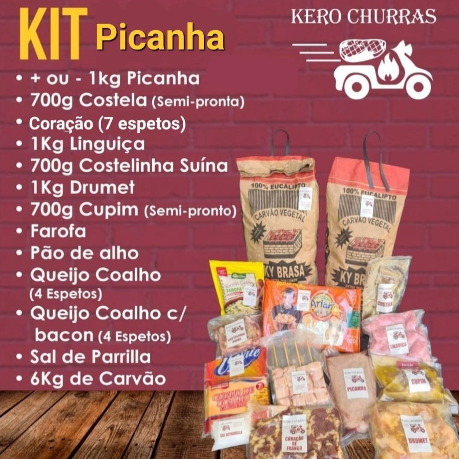Kit churrasco para aprox. 20 pessoas 2kg Contrafilé 2kg Linguiça (frango ou suína) 1kg Drumet (temterada) 1kg Costela (semipronta) 1kg Cupim (semipronto) 1 peça de Picanha suìna 2 pct de pão de alho 1 pct de farofa 300g. Sal de parrila 100g. Carvão 6kg