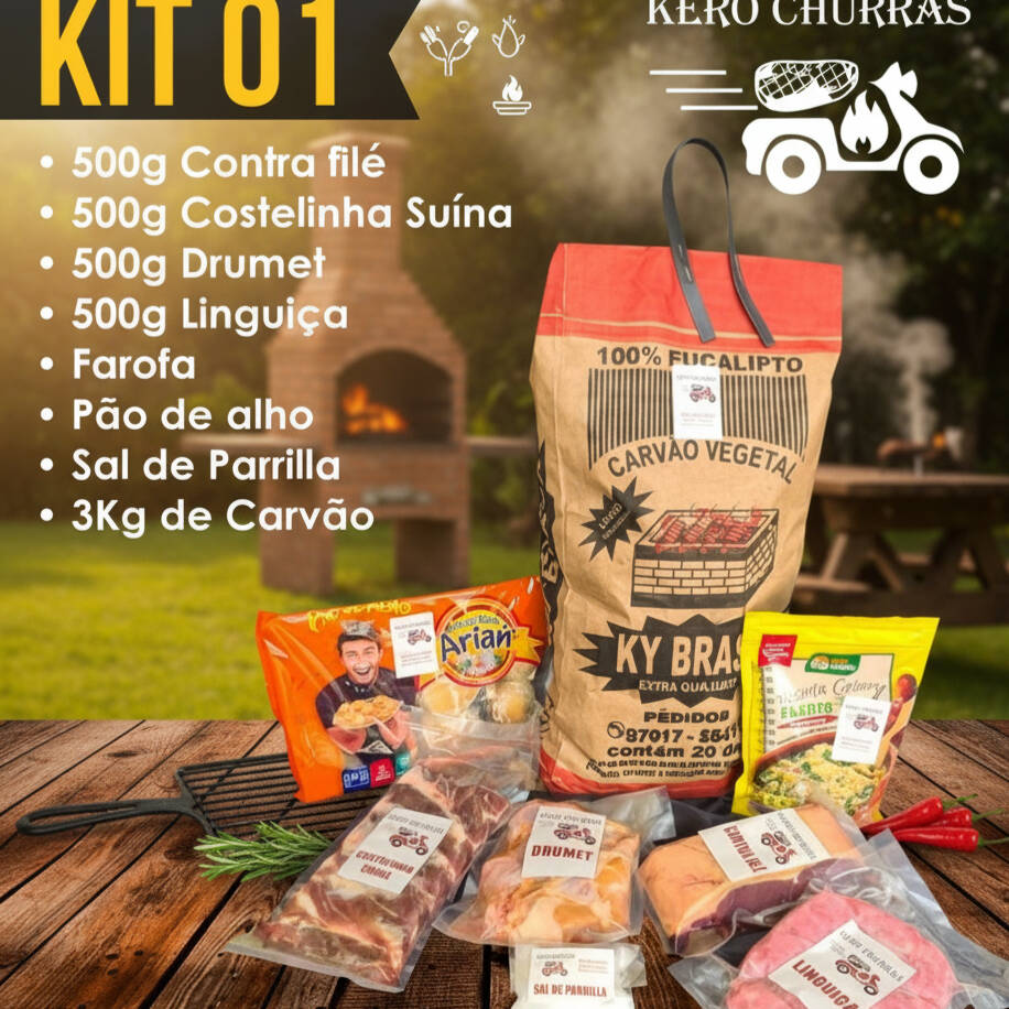 Kit para aprox. 5 pessoas - Contra filé Grill ou Chorizo (500g). Costelinha suína (500g) semipronta. Drumet tempero especial Kero Churras. (500g). Linguiça suína ou de frango (500g). 1 pct de Pão de alho. 1 pct de farofa (300g). Sal de parrilla (100g) 1 saco de carvão (3kg)