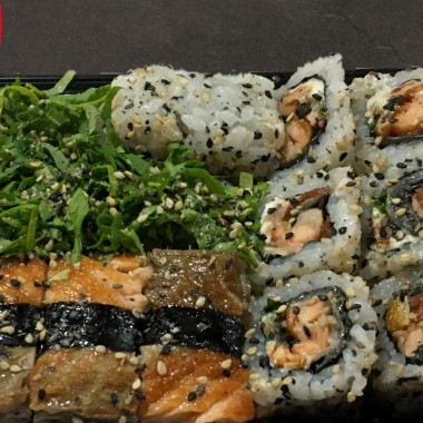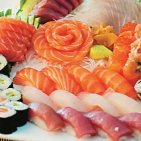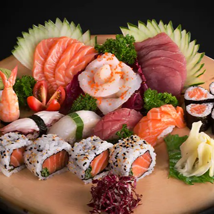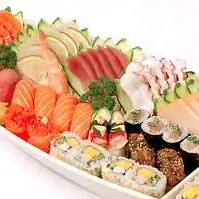 5 sashimis de salmão, 5 sashimis de atum, 1 dupla de sushis de atum, 1 dupla de sushis de peixe branco 2 duplas de sushis de skin,1 dupla de sushis de kani, 5 salmao make, 5 salmao skin, 5 teka make, 5 califórnia e 6 hots philadelfias