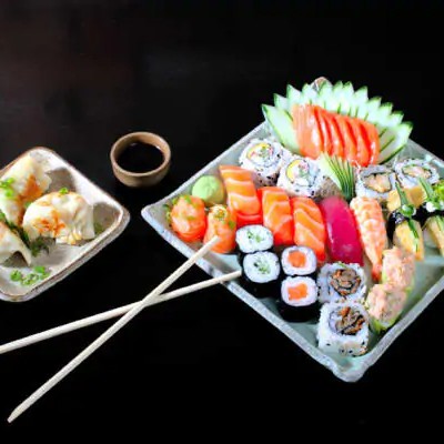 5 sashimis de salmão+ 5 sashimis de atum+5 sashimis de peixe branco+ 4 sushis de salmão+ 4 sushis de atum+ 2 sushis de camarao+ 2 sushis de kani+ 8 tekamake+ 10 californias