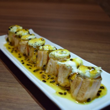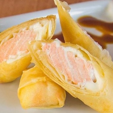 Rolinho primavera recheado com salmão, cream cheese e cebolinha