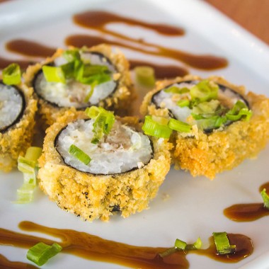 massa de salmão, cream cheese, cebolinha e gergelim, fritas na farinha panko.