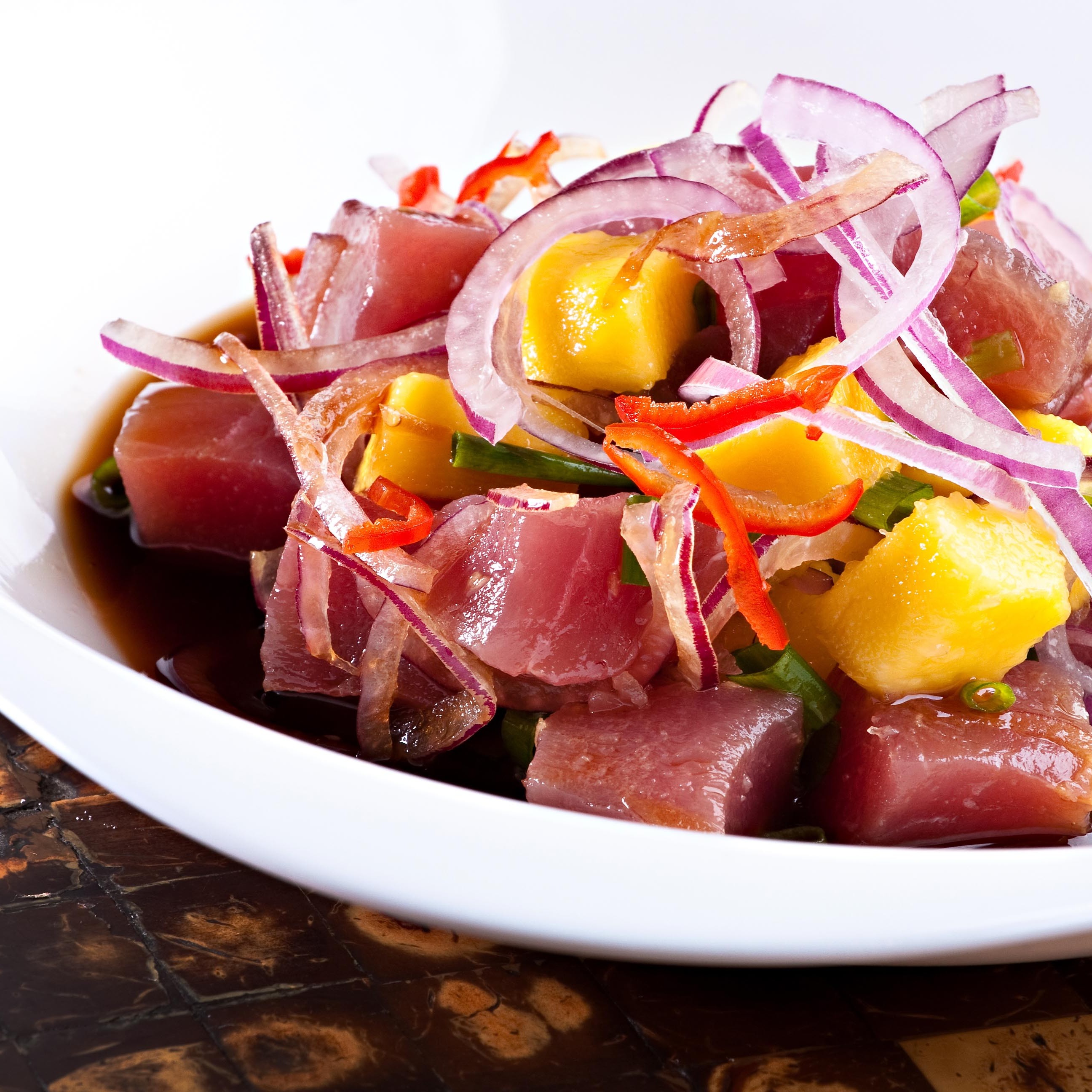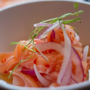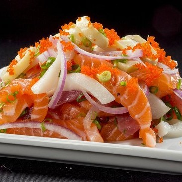 Cubos de salmão, cebola roxa, pimenta dedo de moça, limão e coentro ao azeite