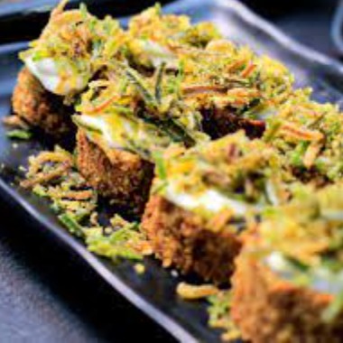 Arroz empanado em formato de pao frito na farinha panko, com recheio de salmão toste cream cheese, cebolinha e gergelim