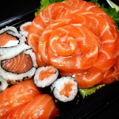 20 sashimis de salmão + 16 sushis de salmão + 10 philadelfias + 12 hots