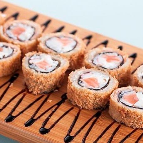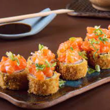 Pensado para os fãs de hot esse é o nig hot crocante! Recheado com creme cheese,salmão, Cebolinha,teriaky e gergelim.