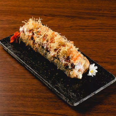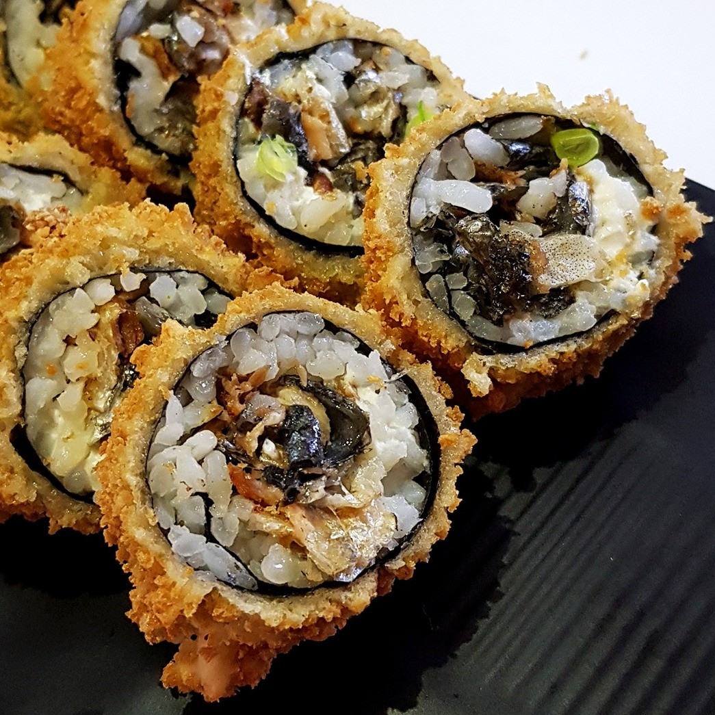 Arroz empanado em formato de pão frito na farinha panko, com recheio de salmao, creram cheese, cebolinha e gergelim