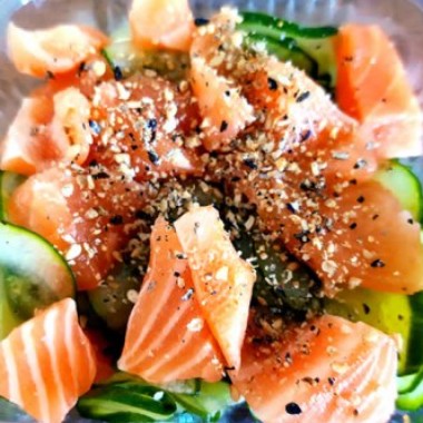 Salada de pepino com salmão e gergelim ao vinagrete