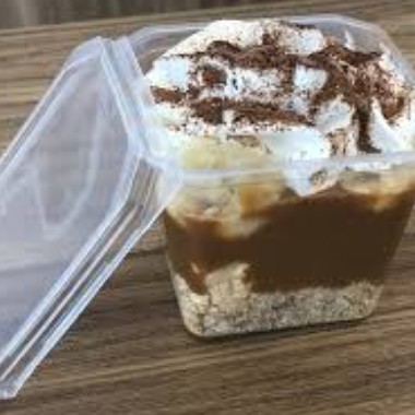 massa de biscoito,banana,doce de leite com cobertura de chantily e canela.