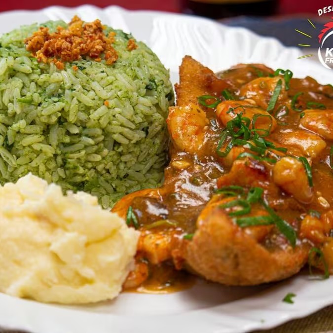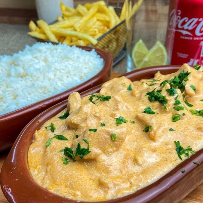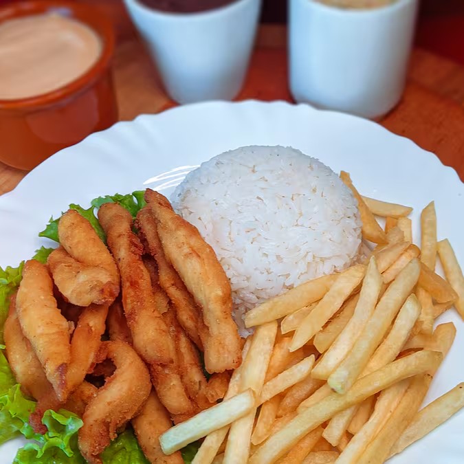 Filé de tilápia empanado e frito, servido com molho de camarão. Acompanha arroz a escolher e complemento.