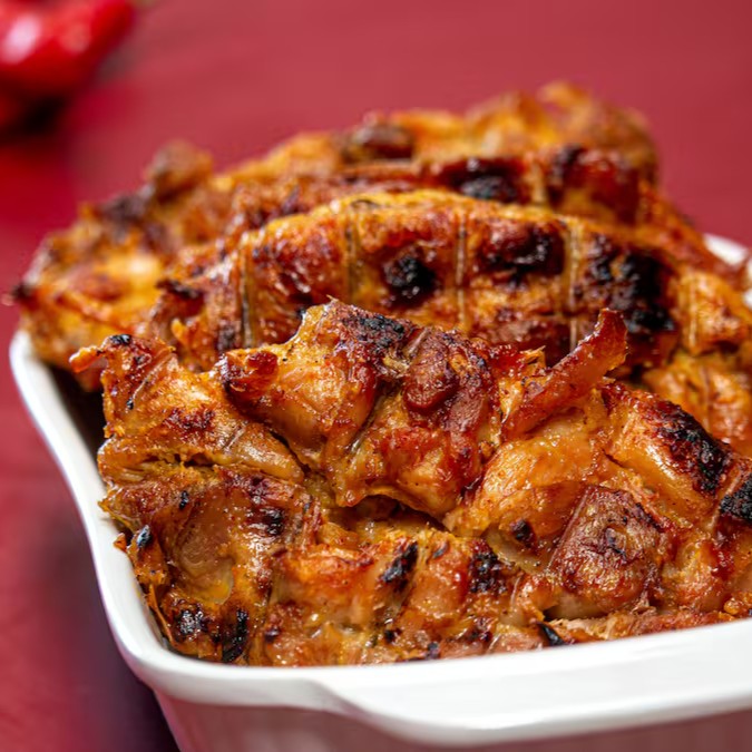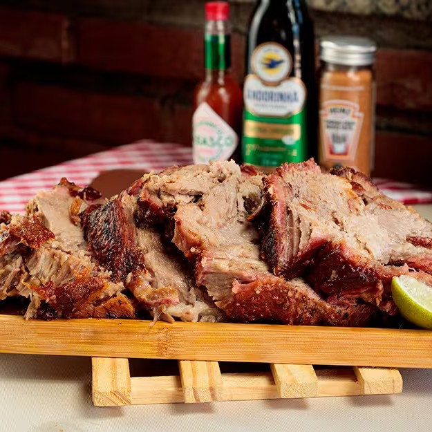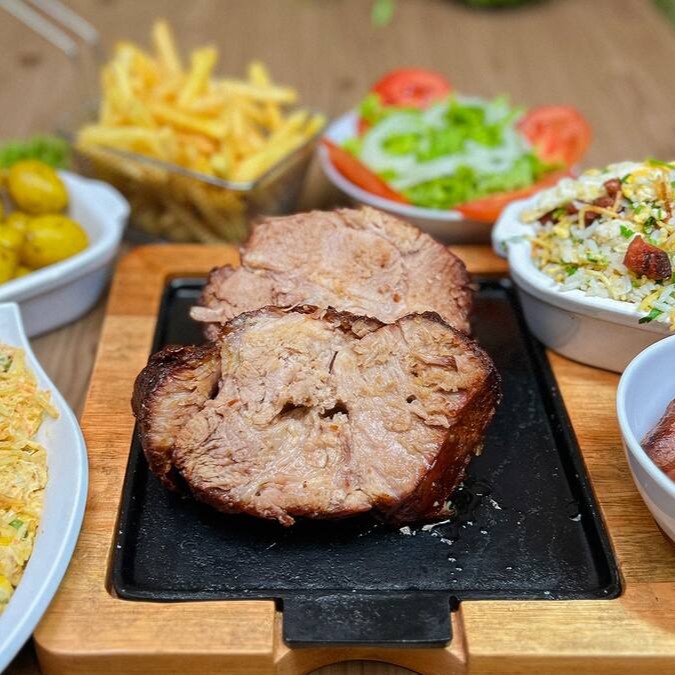 Deliciosa porção de 500g carne suína assada na brasa (sobrepaleta), servida com 1 acompanhamentos a escolher (serve 3 pessoas).