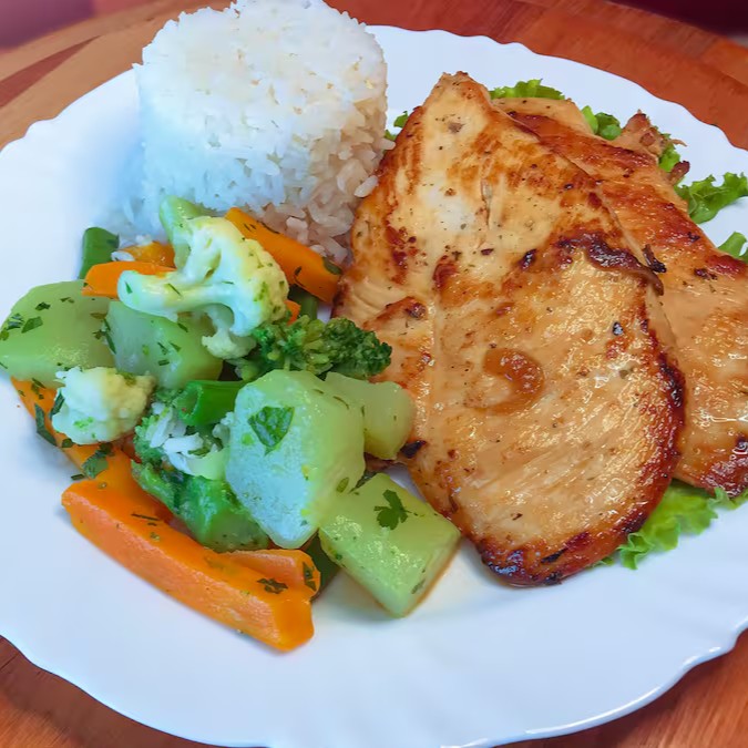 Suculento filé de peito de frango grelhado na hora, servido com arroz branco, feijão