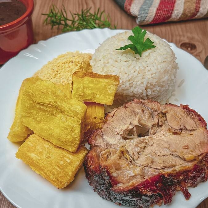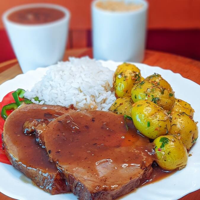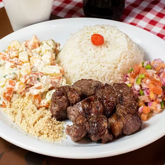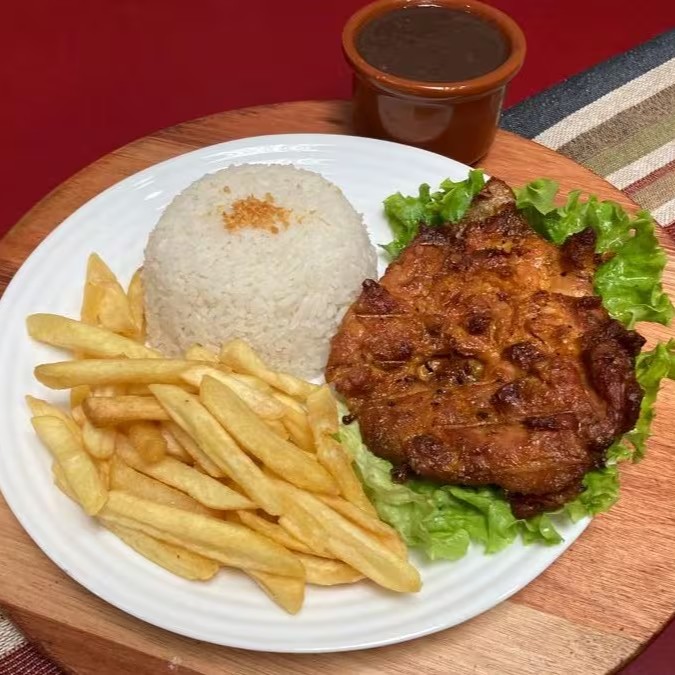 Refeição preparada com corte de Copa Lombo suíno (sobrepaleta) assado na brasa, carne exclusiva da casa, servida com arroz, feijão, farofa e acompanhamento a escolher.