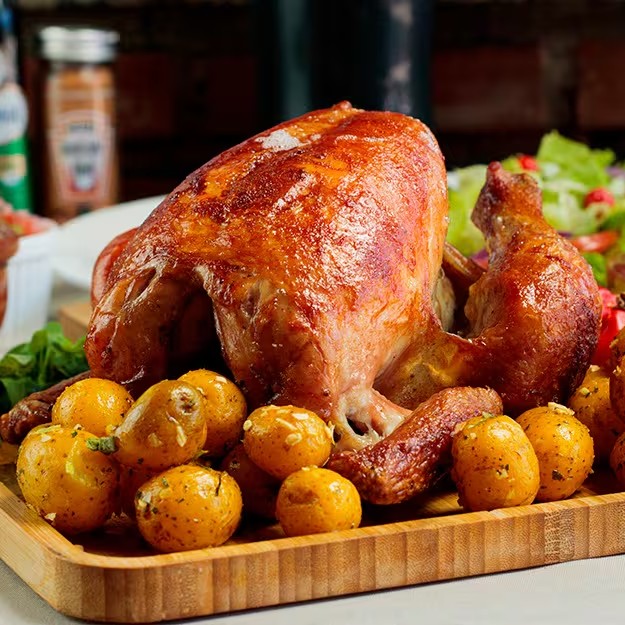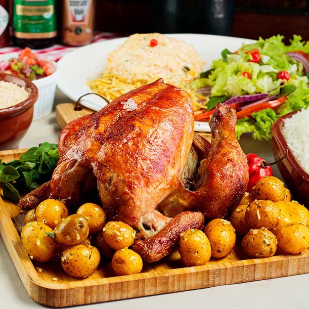 Frango assado na brasa, farofa de bacon crocante, porção de arroz branco, porção de 500g de maionese ou salada italiana(serve de 3 a 4 pessoas).