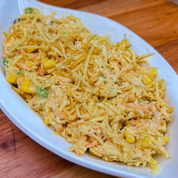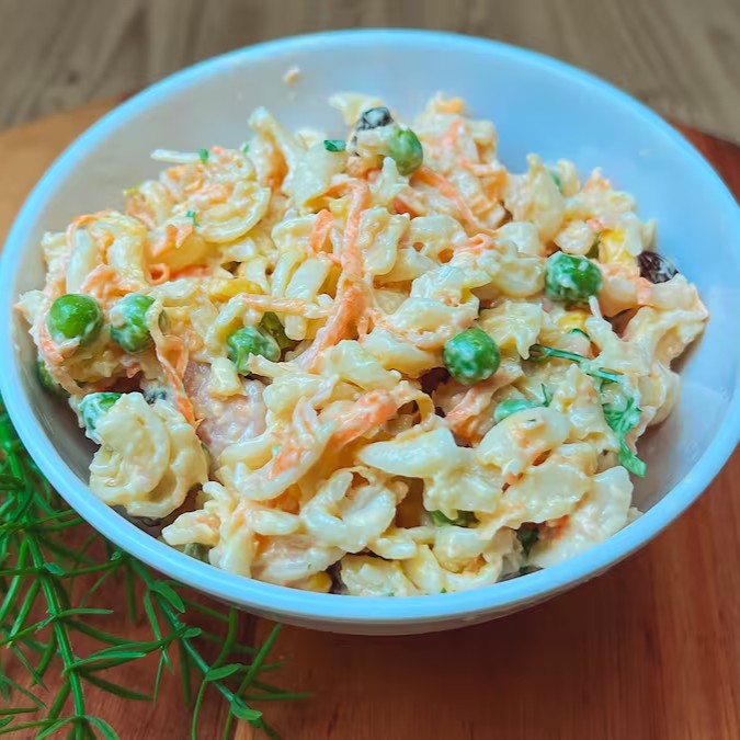 Feita com macarrão parafuso, maionese, cenoura, presunto , passas, ervilha e salsa.