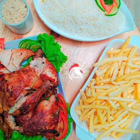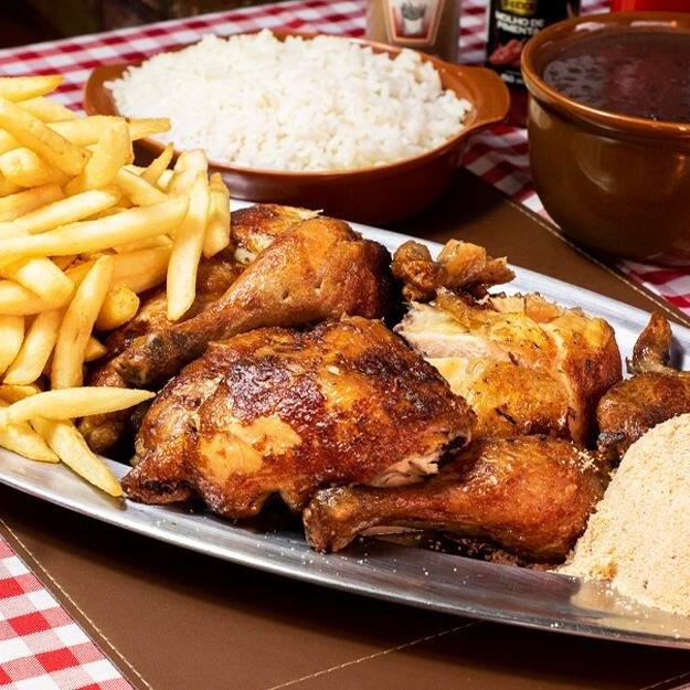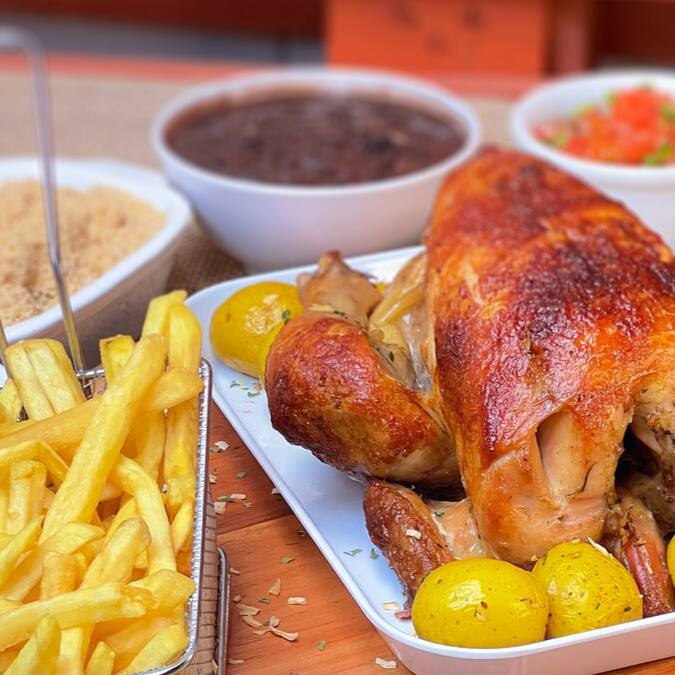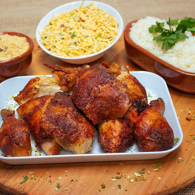 Frango assado na brasa, farofa de bacon crocante, porção de arroz e porção de batata frita ou aipim frito grande (serve 4 pessoas).