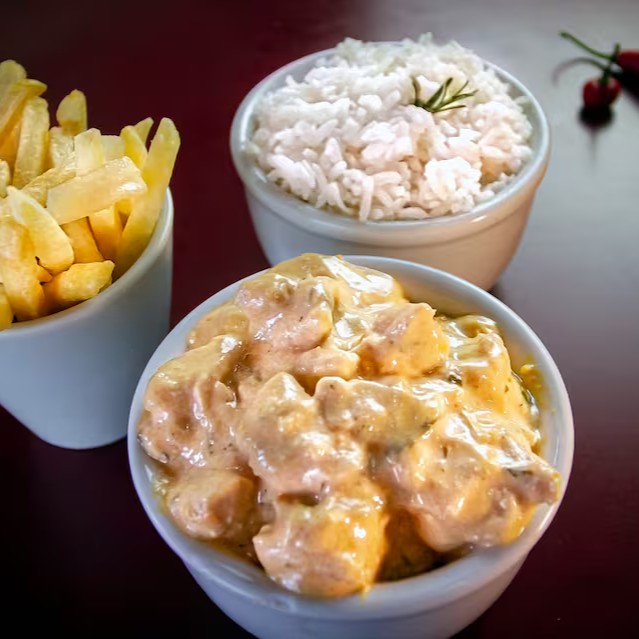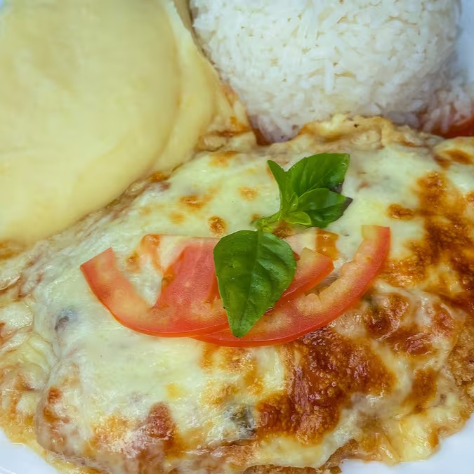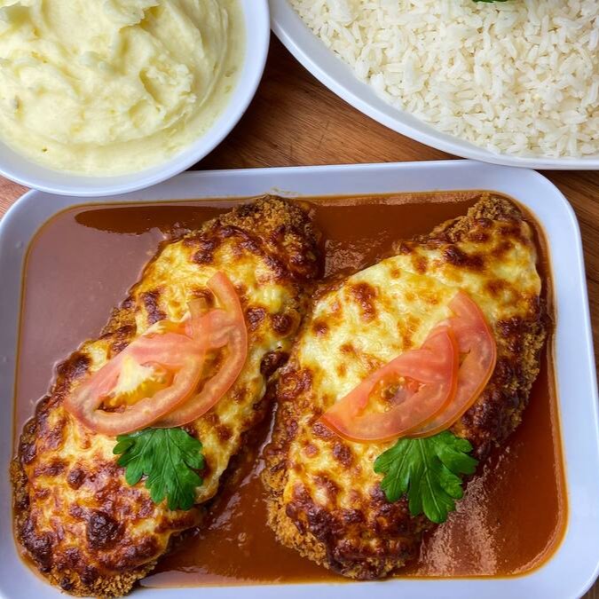 Servido com 2 unidades de filé de peito de frango empanado na farinha panko ao molho de tomate da casa e gratinado com uma bela camada de mussarela. Acompanha porção de arroz branco e porção de purê de batatas.