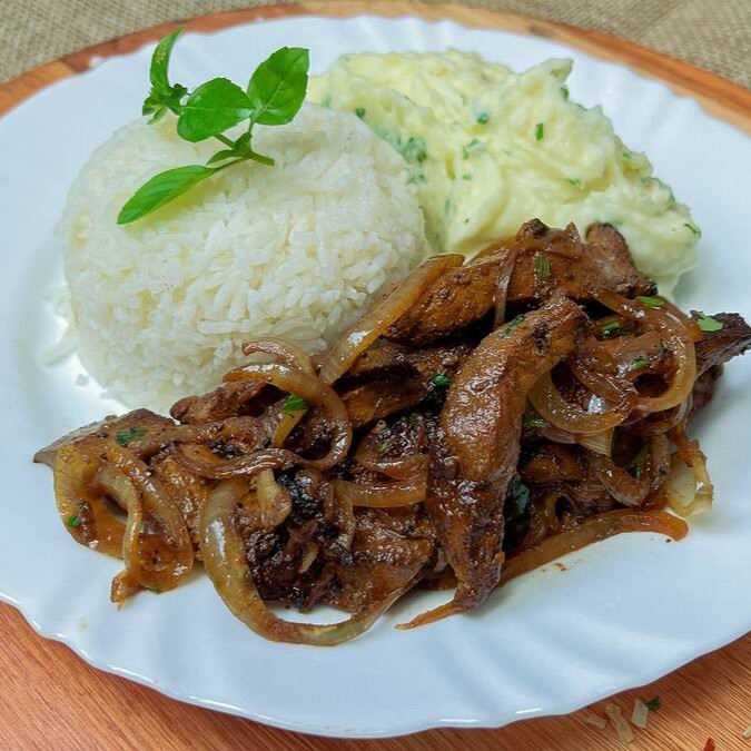 Deliciosas iscas de fígado bovino aceboladas, servido com um cremoso purê de batata.