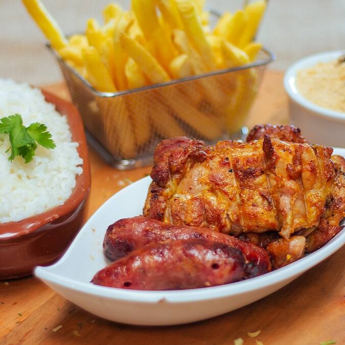 Um clássico irresistível! Esse combo traz o sabor autêntico do frango assado na brasa, combinado com a crocância da farofa de bacon, arroz, feijão e batata frita. Uma refeição completa, perfeita para compartilhar em família ou com amigos, servindo até 3 pessoas. Aproveitar essa promoção é certeza de uma refeição deliciosa e memorável!
