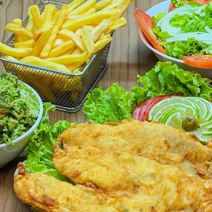 Prato servido com 500g de filé de tilápia empanada, porção de arroz p/ 2, porção de batata e porção de salada de alface, tomate e cebola.