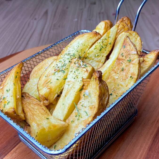 Porção de batata rústica. Porção para 4 pessoas e porção para 2 pessoas.