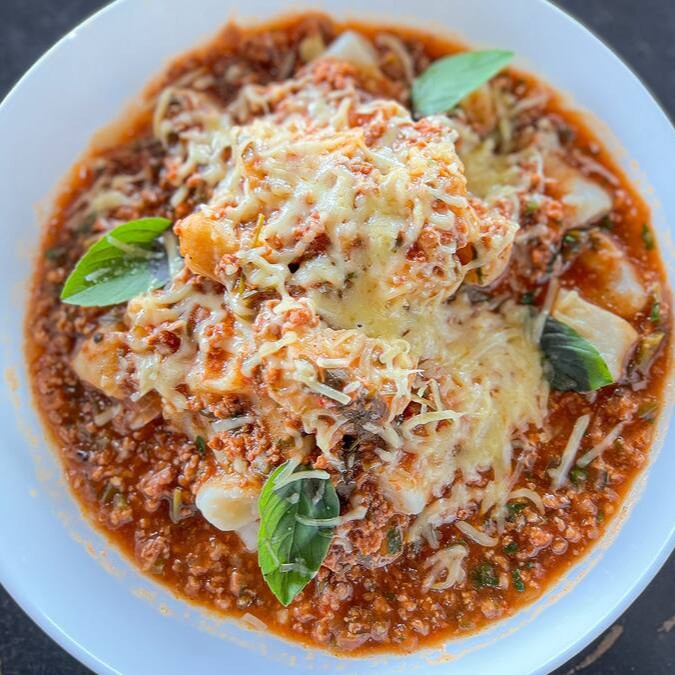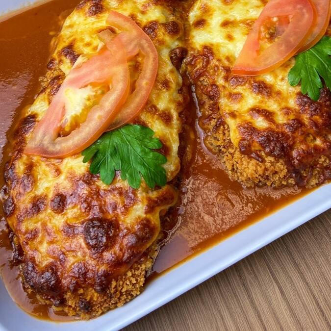 Filé de peito de frango empanado na farinha panko, gratinado com uma generosa camada de queijo mussarela e molho de tomate da caseiro.