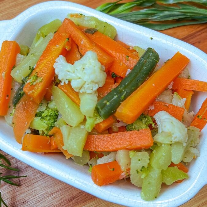 Salada de legumes cozidos contendo chuchu, vagem, cenoura, brócolis e couve flor.