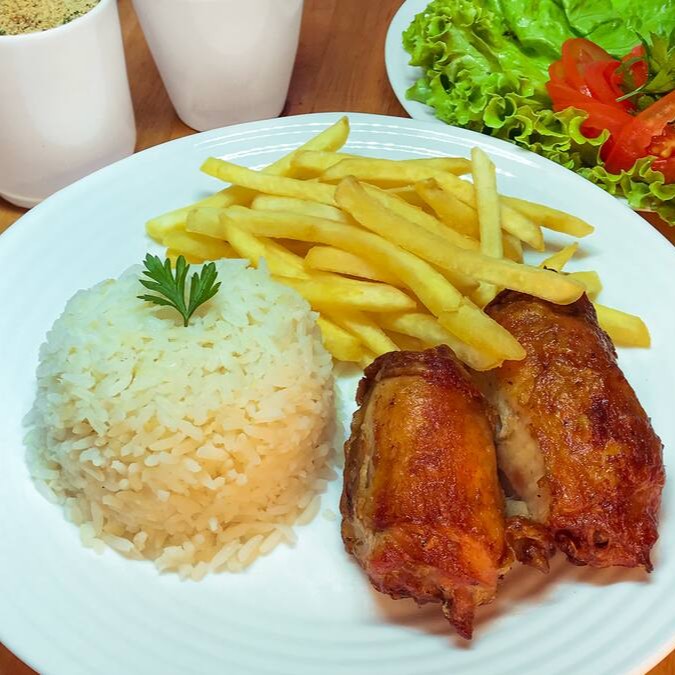 Duas generosas sobrecoxas de frango assadas na brasa, garantindo suculência e aquele sabor defumado irresistível. Acompanhado de arroz branco, feijão preto, farofa crocante de bacon e um acompanhamento à sua escolha. Uma combinação perfeita para quem aprecia um prato caseiro e cheio de sabor.