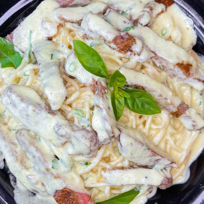 Massa de espaguete servida com iscas de alcatra grelhada ao molho 4 queijos.
