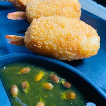 Camarão envolvido com uma lâmina de salmão e cream cheese empanado e frito