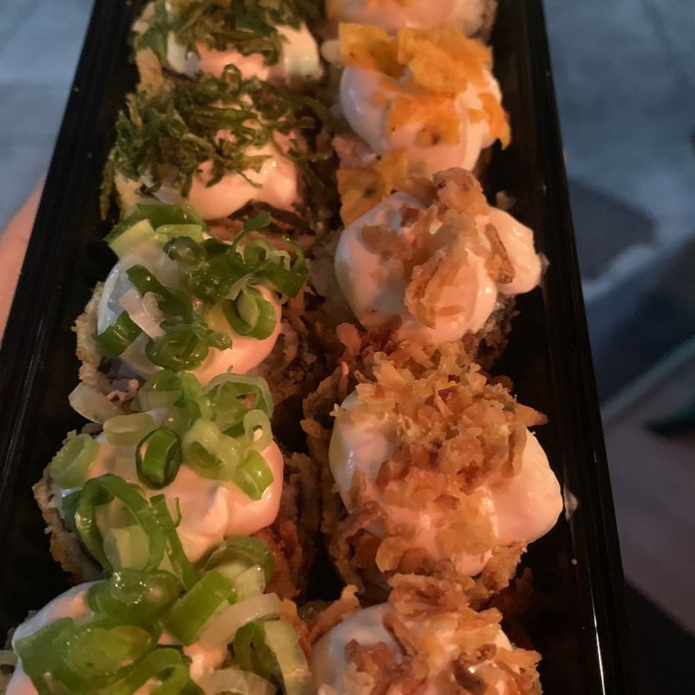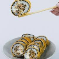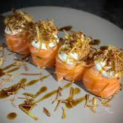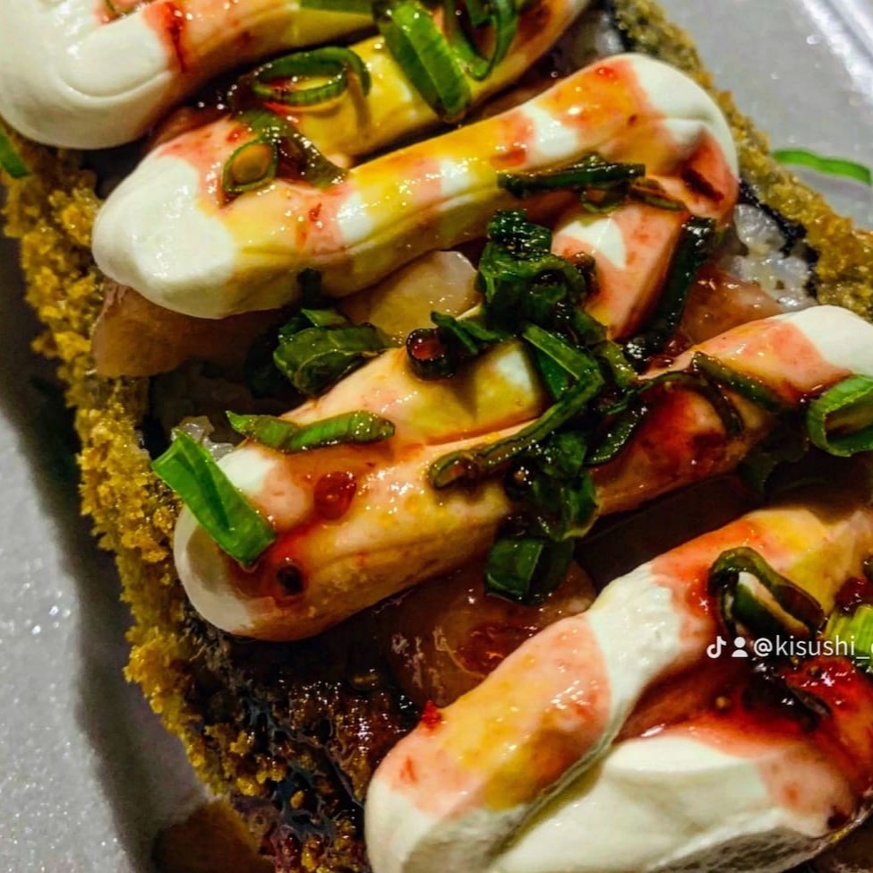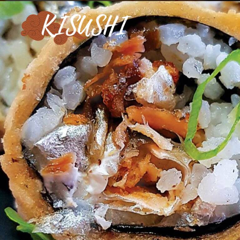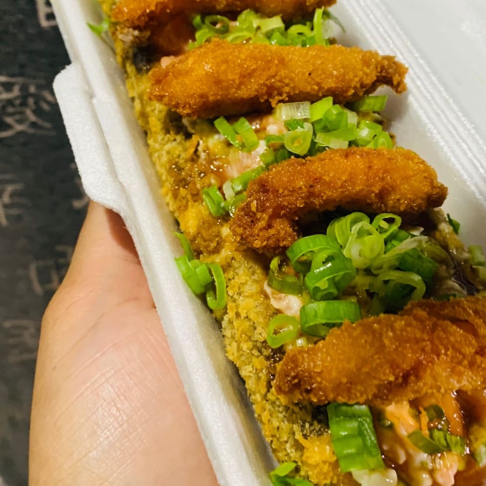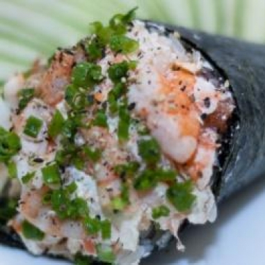 preparado com massa crocante de harumaki no lugar da alga nori, recheado com camarão e cream cheese