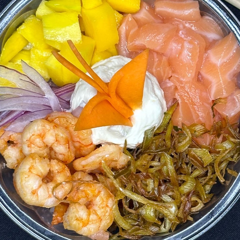 Nesse Poke vai uma base de Gohan (arroz japones), Salmão em cubos, camarão, Manga, Cebola roxa, Cripsy de alho poro e Cream cheese