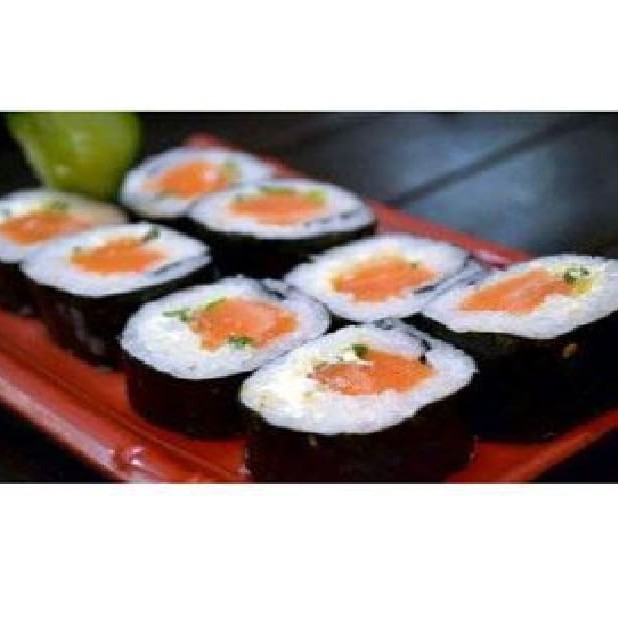 Makimono com recheio de salmão com cream cheese, finalizado com uma fatia generosa de salmão por cima