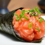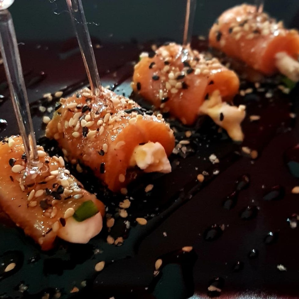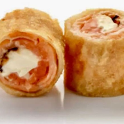 Hot feito da massa do harumaki forrada com salmão, recheio de kani, camarão, cream cheese e cebolinha. obs.: sem arroz