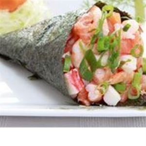 temaki feito com salmão, camarão kani e cream cheese, empanado e frito