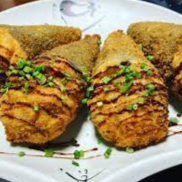 Hotroll empanado e frito, com recheio como camarão e cream cheese, resultando em uma textura crocante por fora e macia por dentro