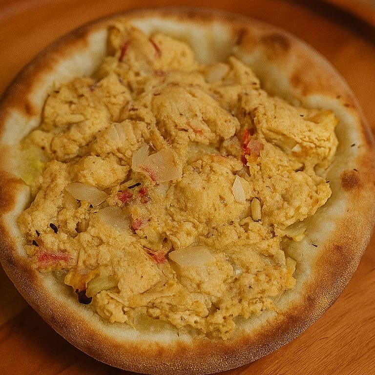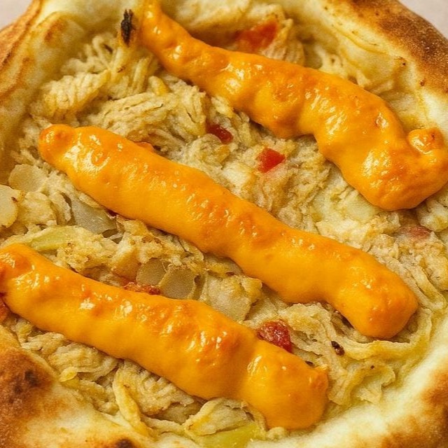 Frango desfiado, tomate, cebola. Especiarias e cheddar